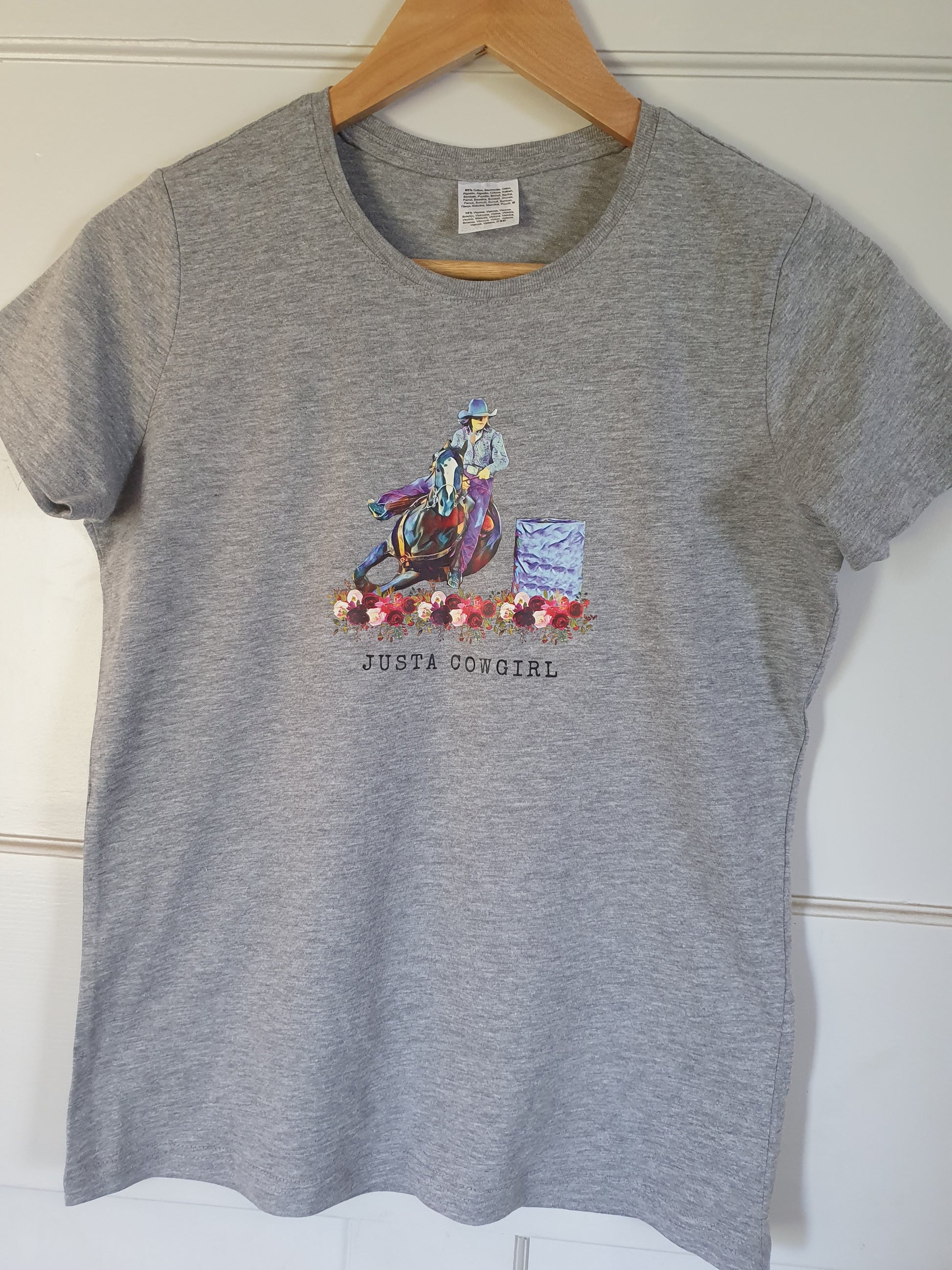 Justa Cowgirl Ladies crew neck tee are a regular fit, 100% preshrunk cotton in Heather.